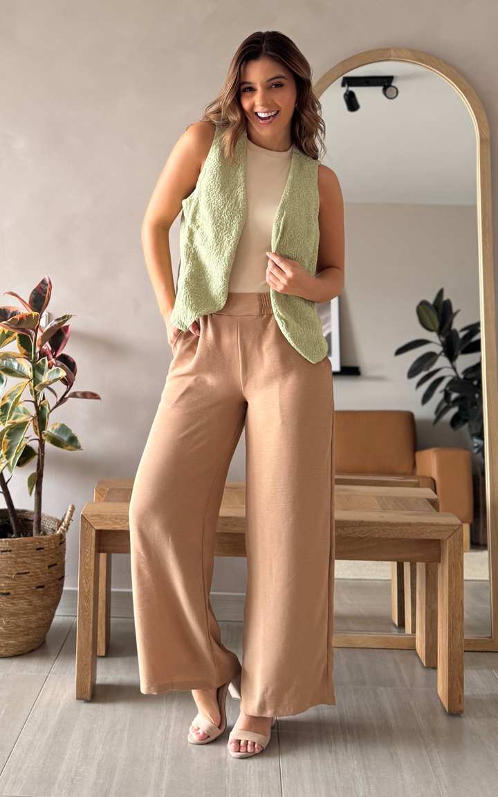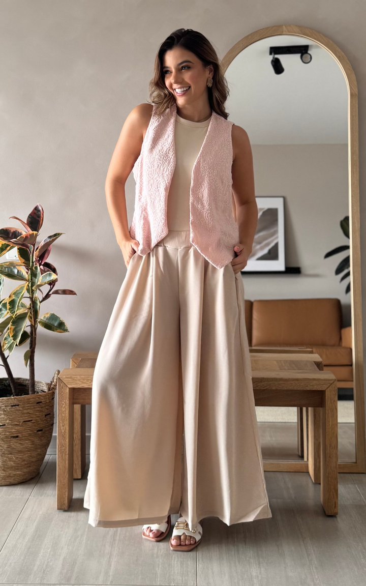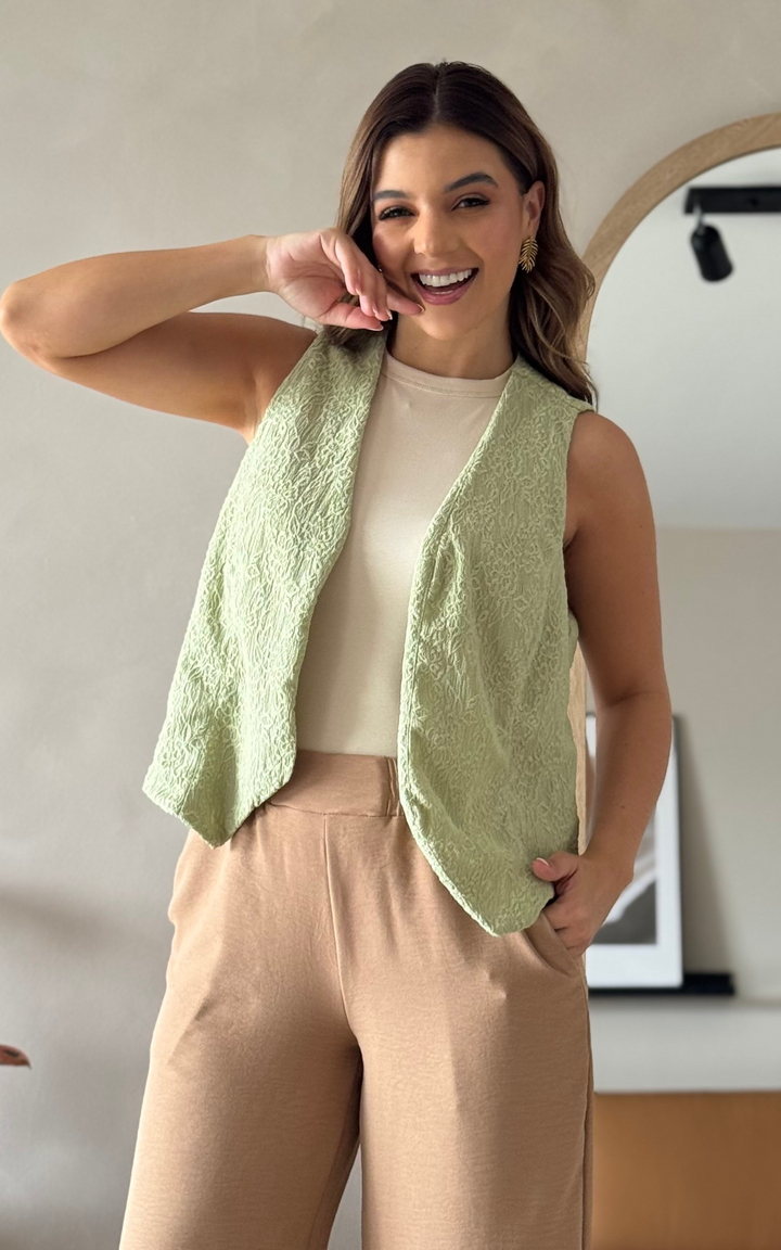 Un chaleco versátil en tela tejida con textura que se convertirá en tu aliado de estilo. Su corte clásico y silueta amplia brindan comodidad sin perder elegancia. Sin botones, es perfecto para llevar abierto como complemento que eleva cualquier look, desde el más casual hasta el más sofisticado.