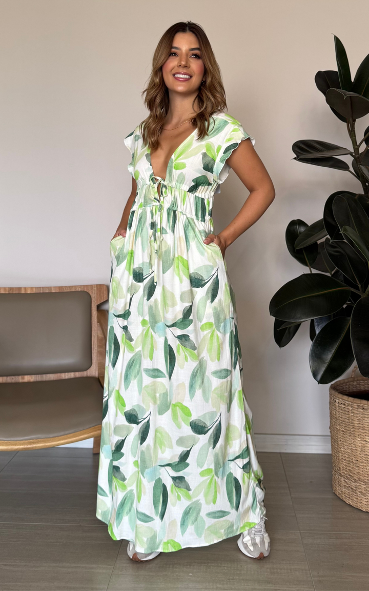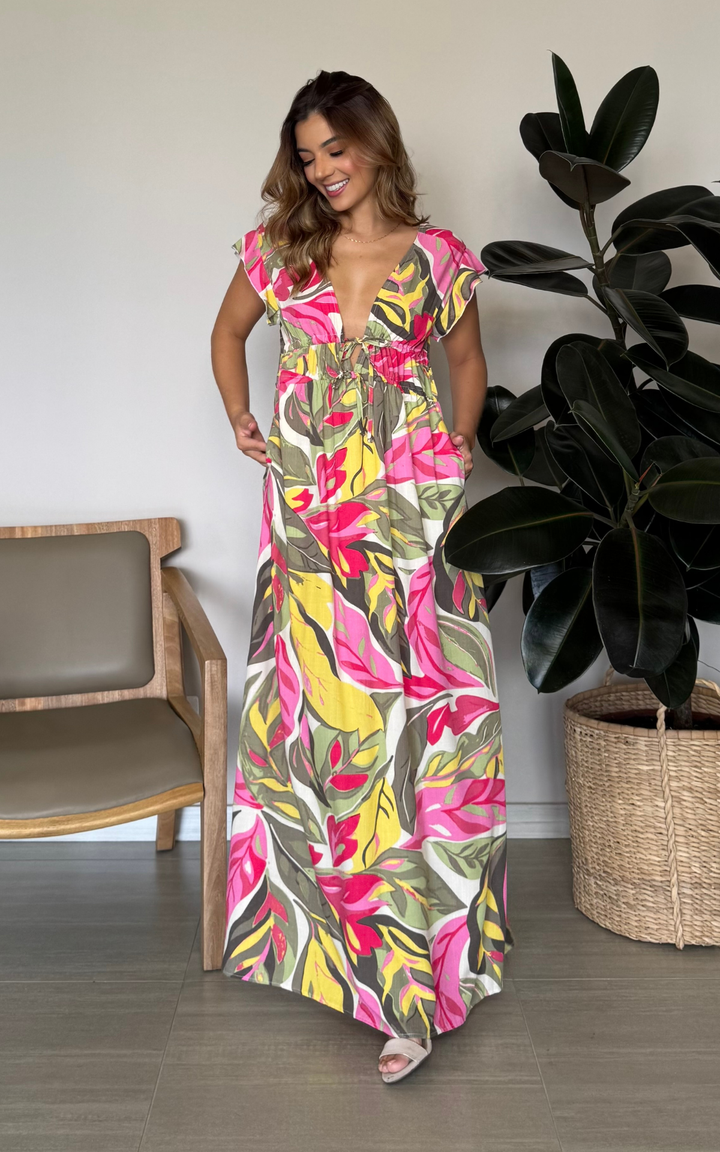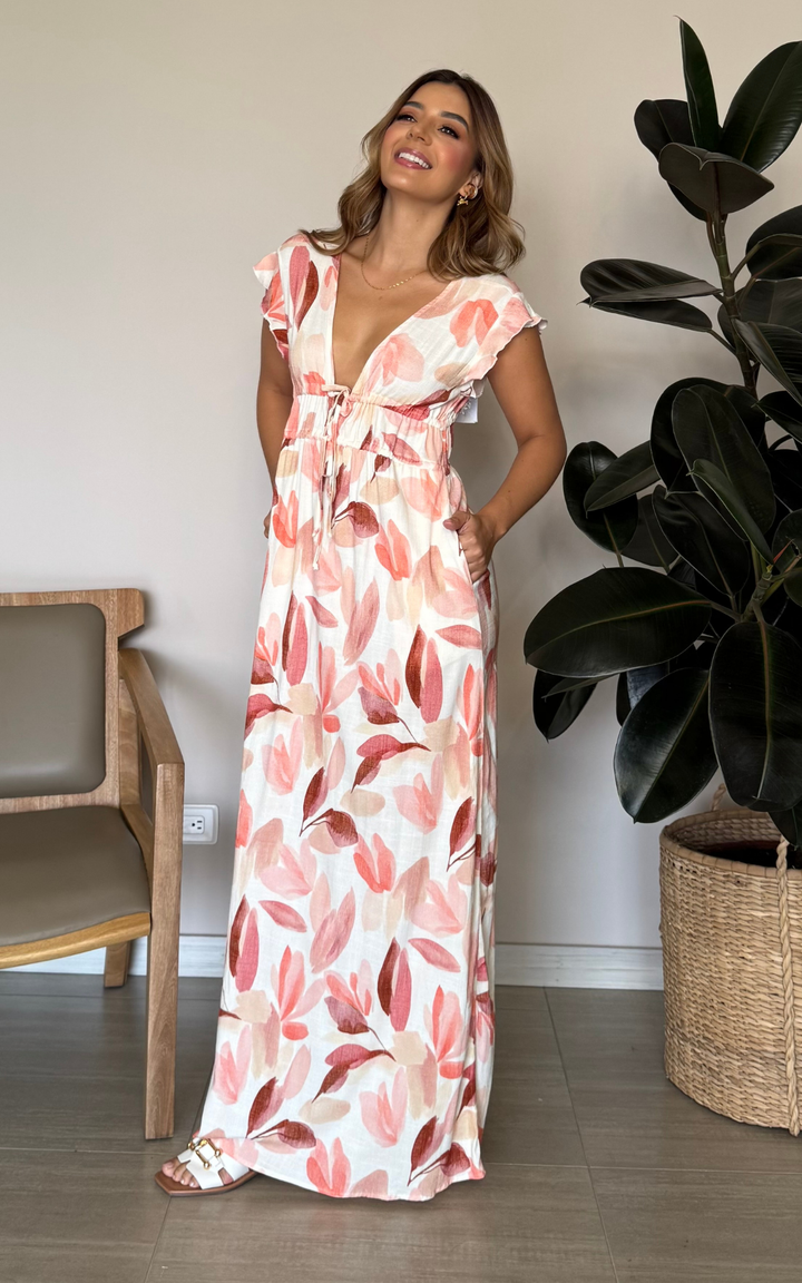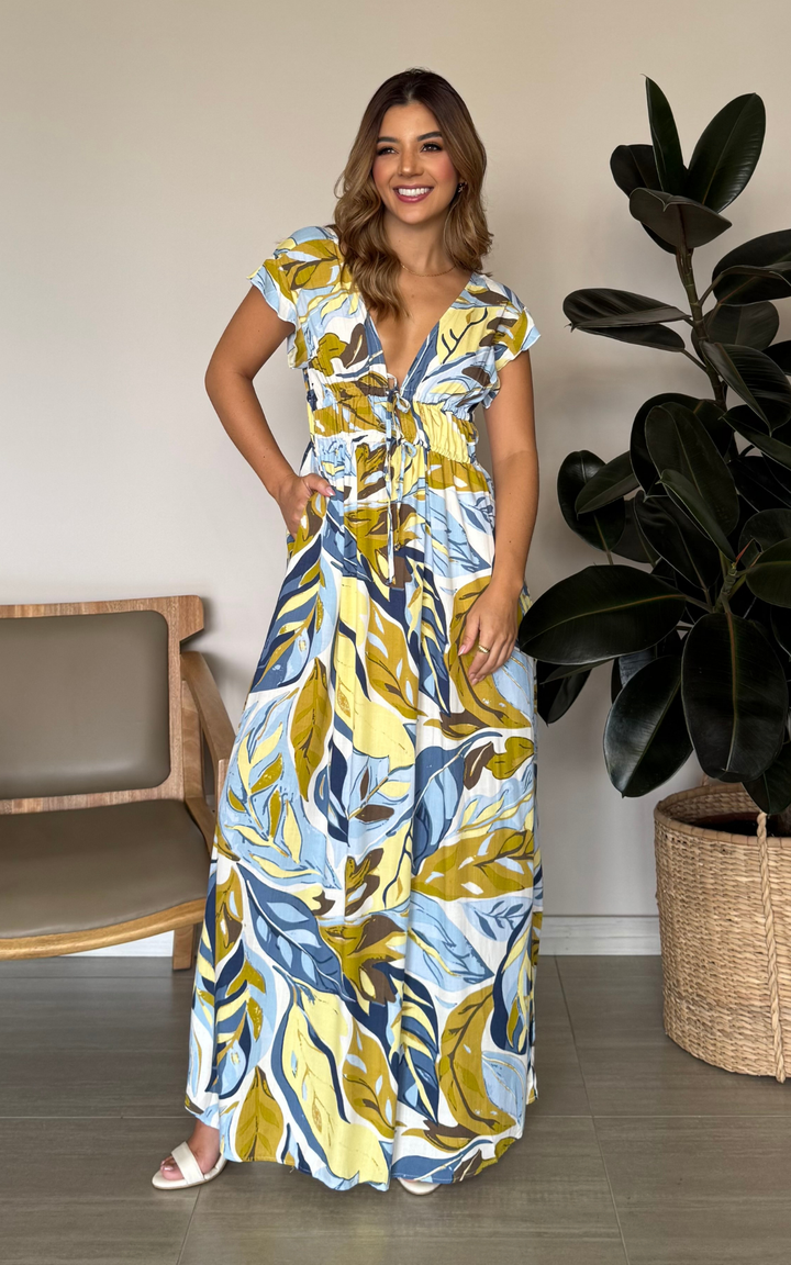 El Vestido Ariel Estampado está diseñado para acompañarte en tus días con comodidad y estilo. Su silueta amplia y fluida se adapta a tu cuerpo, mientras que el escote en V y los boleros en los hombros le dan un toque femenino y romántico.